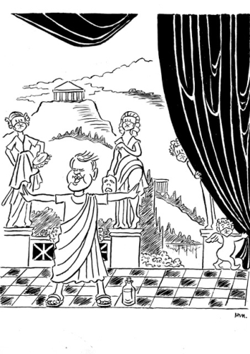 Udkast til Det Kongelige Teaters nye Akropolisfortæppe, hvor teaterchefen opfordrer til at holde afstand og spritte af. (Ascolta juni 2021).